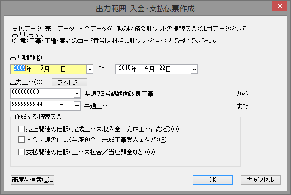【入金・支払伝票作成ー出力範囲】 入金や支払かかわるConstのデータを財務会計ソフトのCSV形式にて出力します。 完成工事未収入金/完成工事高などの仕訳が作成されます。 ●出力範囲 振替伝票作成のボタンを押すと、先の範囲指定画面が現れます。 日報日付の期間、出力する工事の範囲を指定します。 ●作成する振替伝票 Constの「売上伝票」、「入金伝票」、「支払伝票」を指定します。