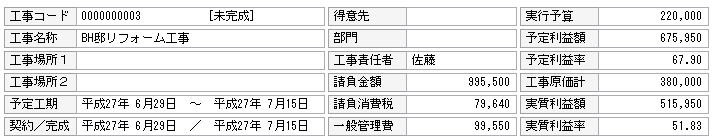 予定原価率とは、実行予算額を契約金額(税抜き)で除算し100(%)を乗算したものです。実質原価率とは、工事原価累計金額を契約金額(税抜き)で除算し100(%)を乗算したものです。