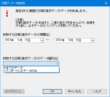 「日報データ削除」で「削除するデータ種別(0:全て/1:インポートデータ)」の指定を追加しました。